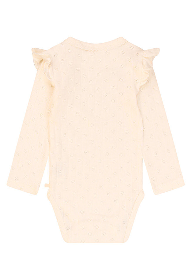 Een lieve en praktische basic met een romantische touch, perfect voor de allerkleinsten. De ajourstof met kleine hartjes geeft de romper een lieve, subtiele uitstraling en zorgt tegelijkertijd voor een luchtig effect. Dankzij de praktische drukkers op de schouder en bij het kruis is aan- en uitkleden én verschonen extra gemakkelijk.