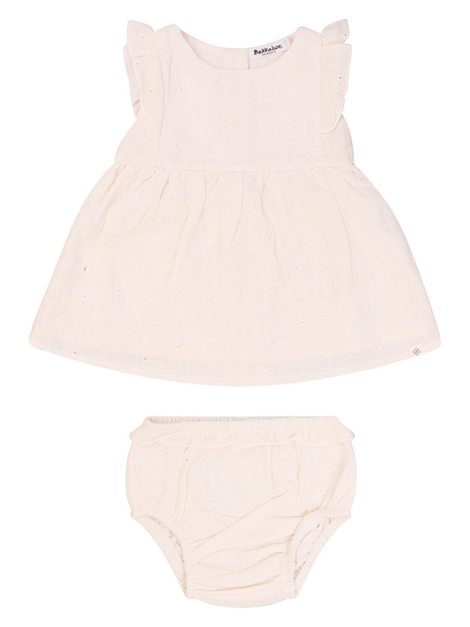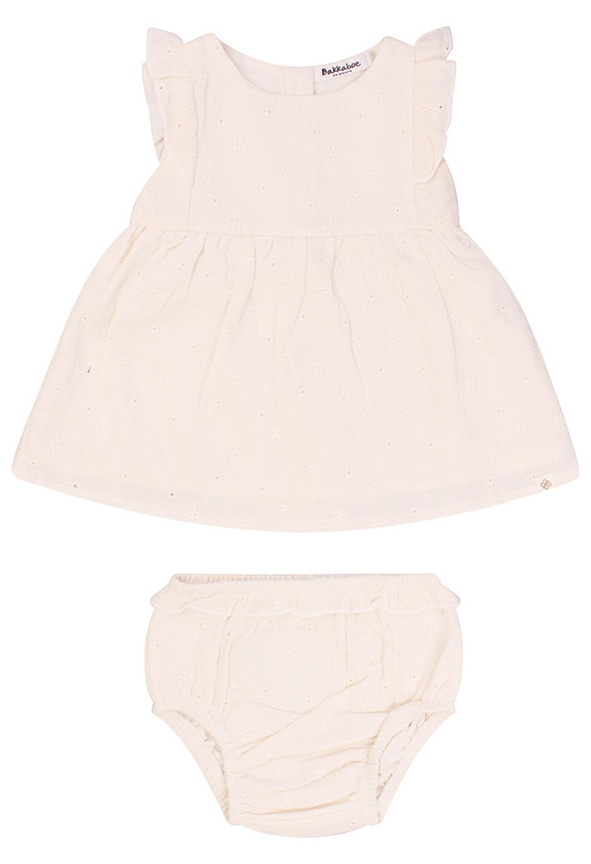 Deze lieve 2-delige newborn set is perfect voor de allerkleinsten. De set bestaat uit een jurkje en een bijpassend broekje, beide gemaakt van 100% zacht katoen dat heerlijk aanvoelt op de tere babyhuid. Het jurkje is versierd met een schattig broderie patroon, wat een subtiele, elegante uitstraling geeft. Het bijpassende broekje maakt de set compleet en zorgt voor een comfortabele en praktische outfit voor je kleintje.