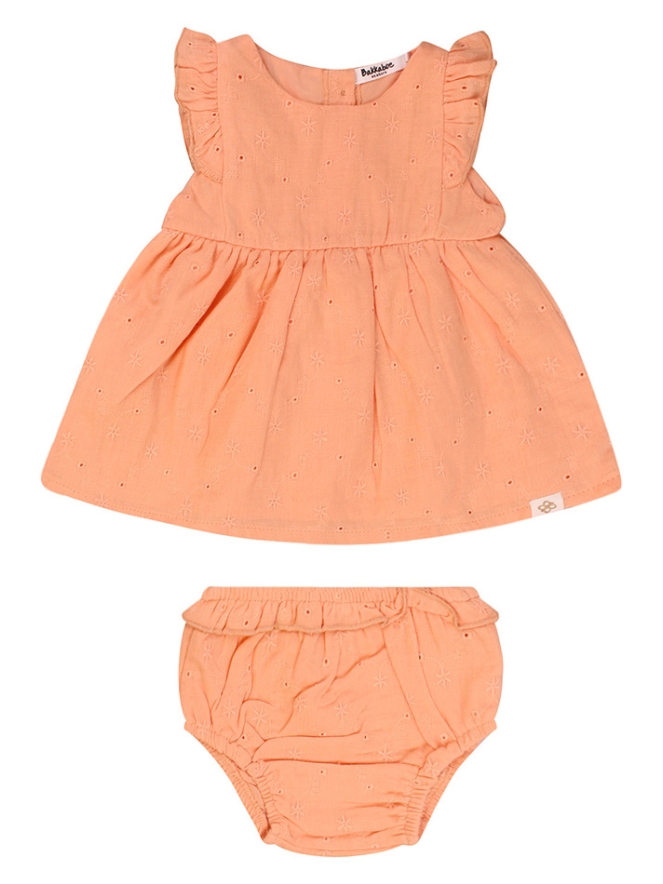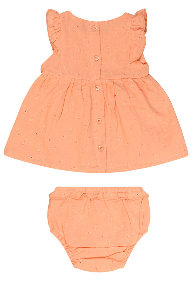 Deze lieve 2-delige newborn set is perfect voor de allerkleinsten. De set bestaat uit een jurkje en een bijpassend broekje, beide gemaakt van 100% zacht katoen dat heerlijk aanvoelt op de tere babyhuid. Het jurkje is versierd met een schattig broderie patroon, wat een subtiele, elegante uitstraling geeft. Het bijpassende broekje maakt de set compleet en zorgt voor een comfortabele en praktische outfit voor je kleintje.