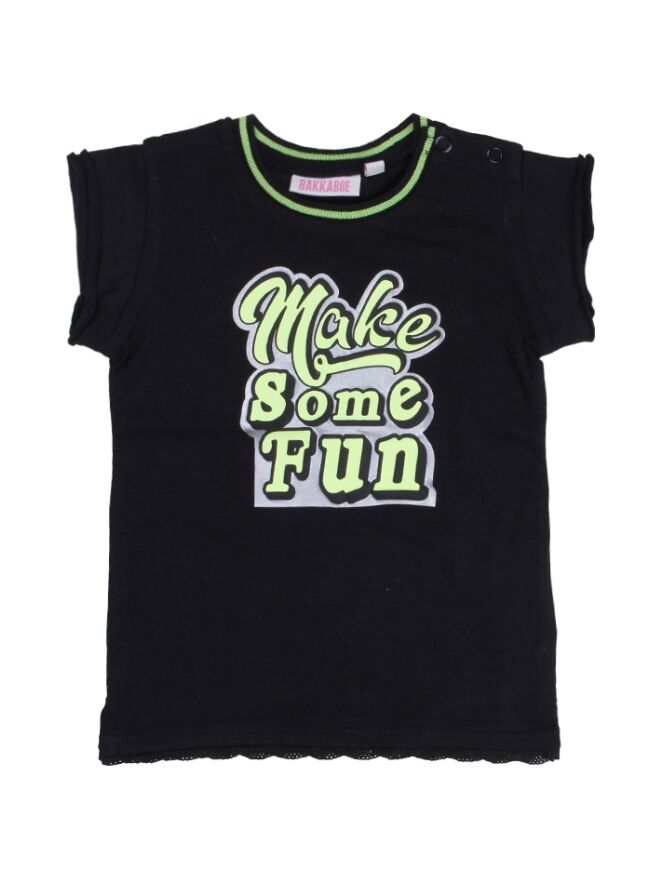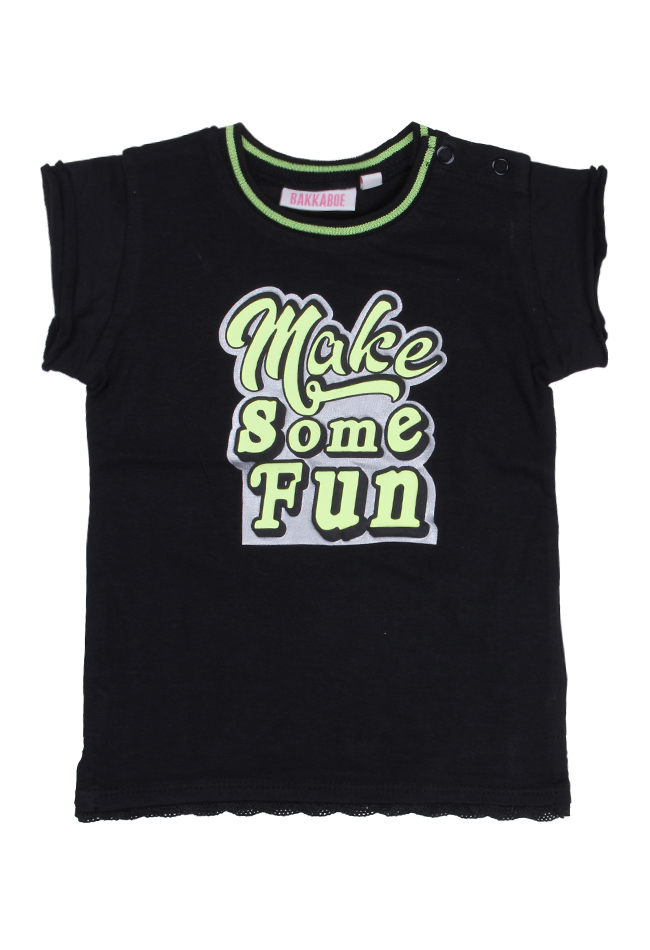T-shirt voor de baby meisjes van Bakkaboe met een grote tekstprint voorop. Aan de onderkant zit een roezelrandje.Kwaliteit: 95% katoen, 5% elastane.