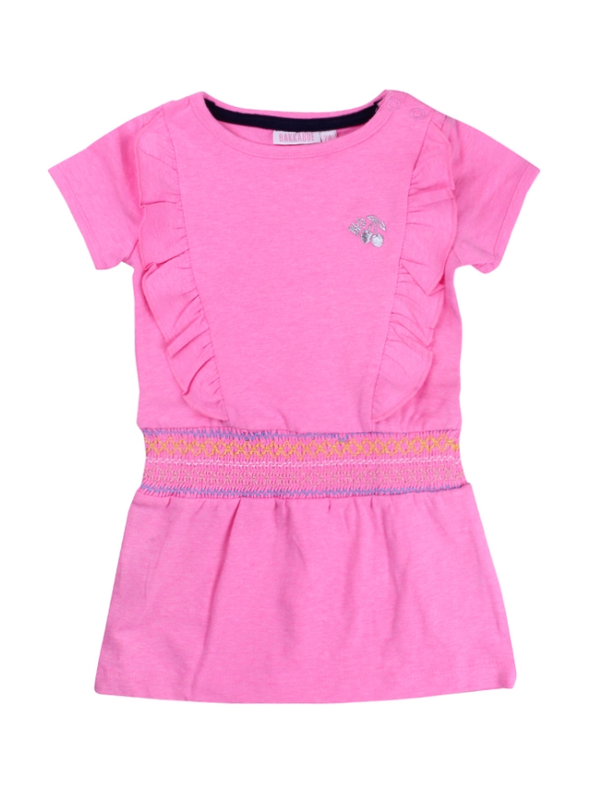 T-shirt jurk voor de baby meisjes. De jurk heeft ruches langs de voor kant en een elastieken band met borduursels door de middel
