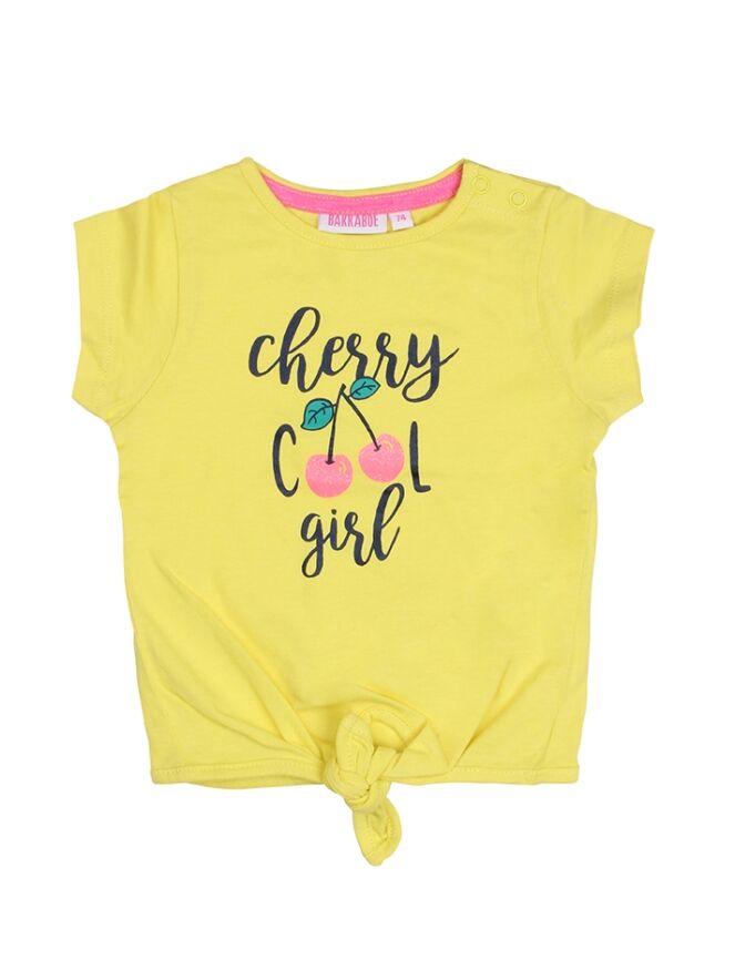 T-shirt met tekst en print voor baby meisjes het t-shirt heeft een knoop detail aan de onderkant. Kersen print met de tekst Cherry cool girl.