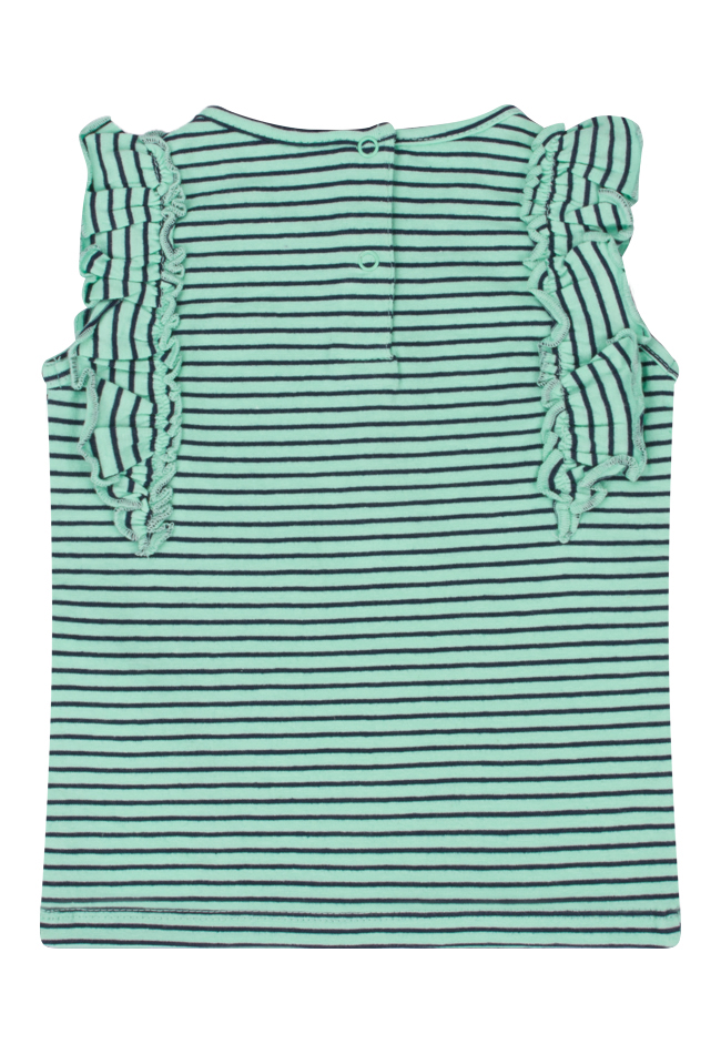 T-shirt van Bakkaboe. Het t-shirt is gestreept en heeft roezel randjes bij de mouwen. Materiaal: 95% katoen, 5% elasthan. 30 graden wassen, niet bleken, niet in de droger, lauw strijken.