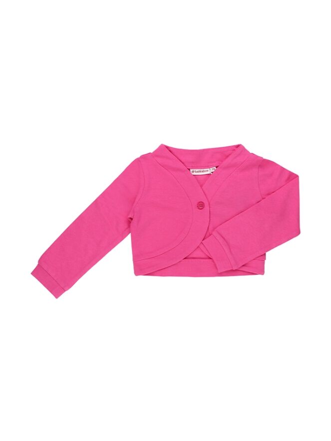 Kort vestje van Bakkaboe. Het vest heeft 1 knoopje en lange mouwen. Materiaal: 95% katoen, 5% elasthan. 40 graden wassen, niet bleken, kan in de droger, koud strijken.