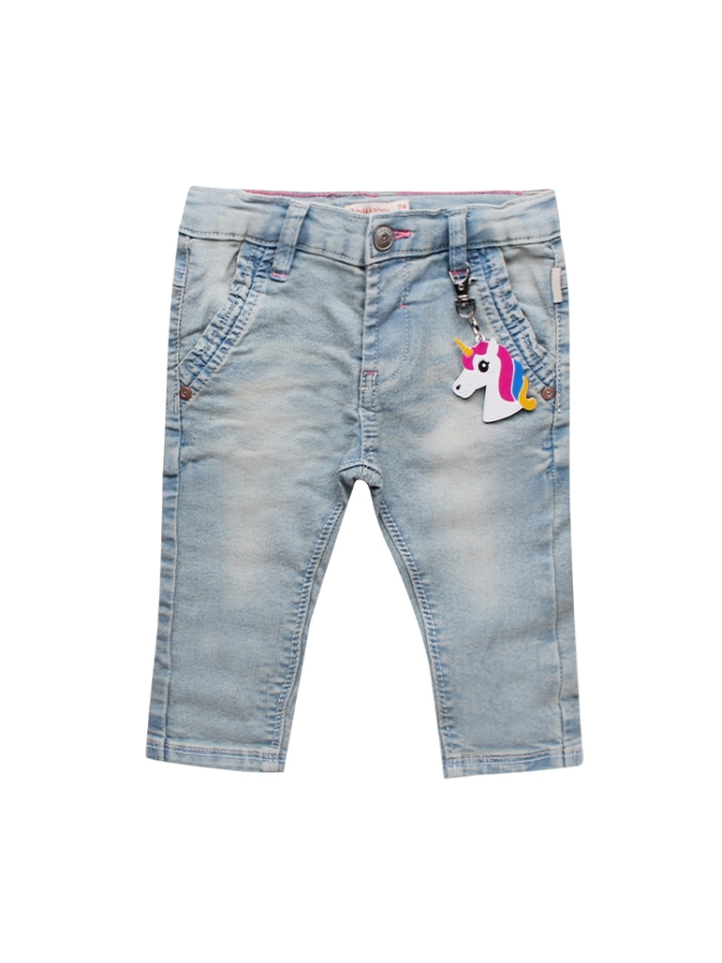 Jeans van Bakkaboe. De jeans hebben een gewone pasvorm en er zit stretch in. Er zit een eenhoorn sleutel hanger bij. Materiaal: 70% katoen, 29% polyester, 1% elasthan. wassen op 30 graden, niet bleken, niet in de droger, kan gestreken worden.