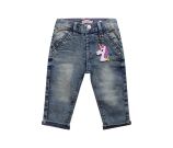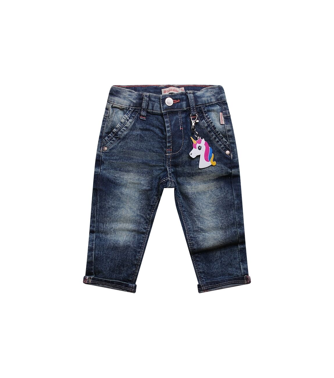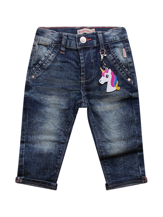 Deze stoere meisjes jeans heeft een elastiek aan de binnenkant om de jeans strakker te maken om de taille. De jeans heeft aan de voorkant en achterkant steekzakken en de jeans heeft een schuifknoop. Aan de voorkant hangt nog een leuke unicorn sleutelhanger.