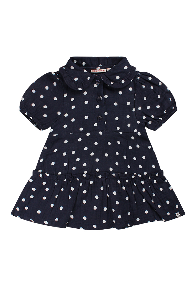 Jurk met een allover stippenprint. De jurk heeft pofmouwen en een ronde kraag. Voorop zit een knoopsluiting en de jurk heeft een stroken rok.