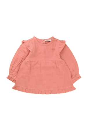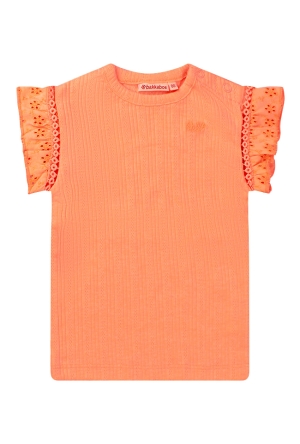 T-shirt met ruffel mouwen van Bakkaboe. Dit zomerse t-shirt is verkrijgbaar in drie kleuren. Op de voorkant zit een geplaatste flamingoprint. Het t-shirt heeft een ronde hals, en de kleinste maten hebben achterop knoopjes bij de hals.
