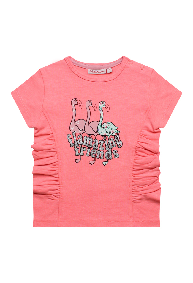 Dit vrolijke t-shirt heeft een glitter flamingo print aan de voorkant. De zijkant van het t-shirt is gerimpeld. Bij de kleinste maten zitten op de schouder twee drukknoopjes zodat het aan/-uittrekken gemakkelijker gaat. Het t-shirt is verkrijgbaar in drie zomerse kleuren.