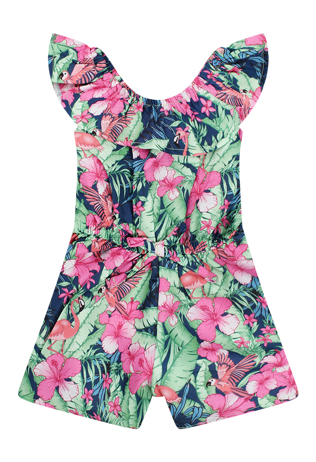 Jumpsuit met een allover tropische print een ruche bij de hals en een elastiek in de tailleband.
