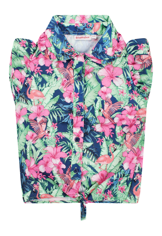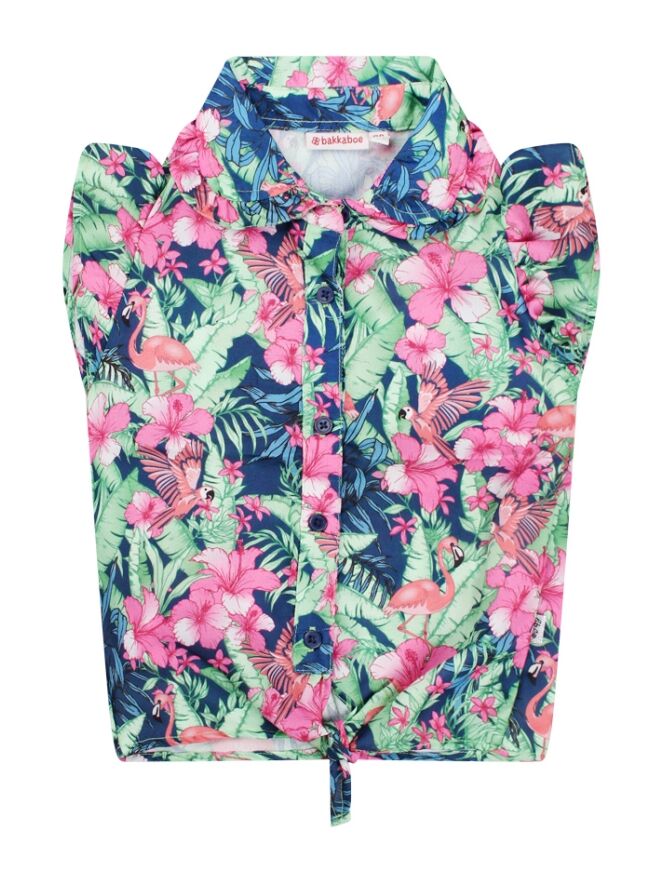 Blouse met een allover tropische print, ronde kraag, vlindermouwen en een strikdetail aan de voorkant.