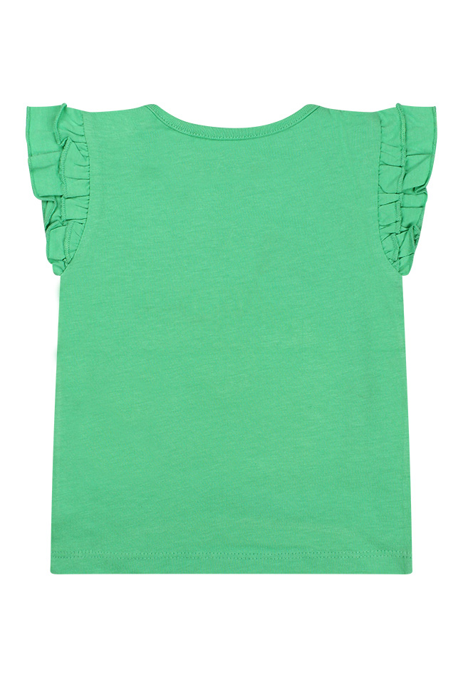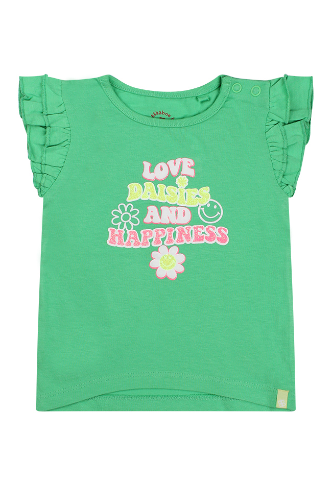 Dit shirtje heeft een korte ruche op de schouders en een ronde hals. Op de voorkant van het t-shirt zit een puff/glitter print. Bij de kleinste maten zitten op de schouder twee drukknoopjes zodat het aan/-uittrekken gemakkelijker gaat. Dit t-shirt is verkrijgbaar in drie zomerse kleuren.