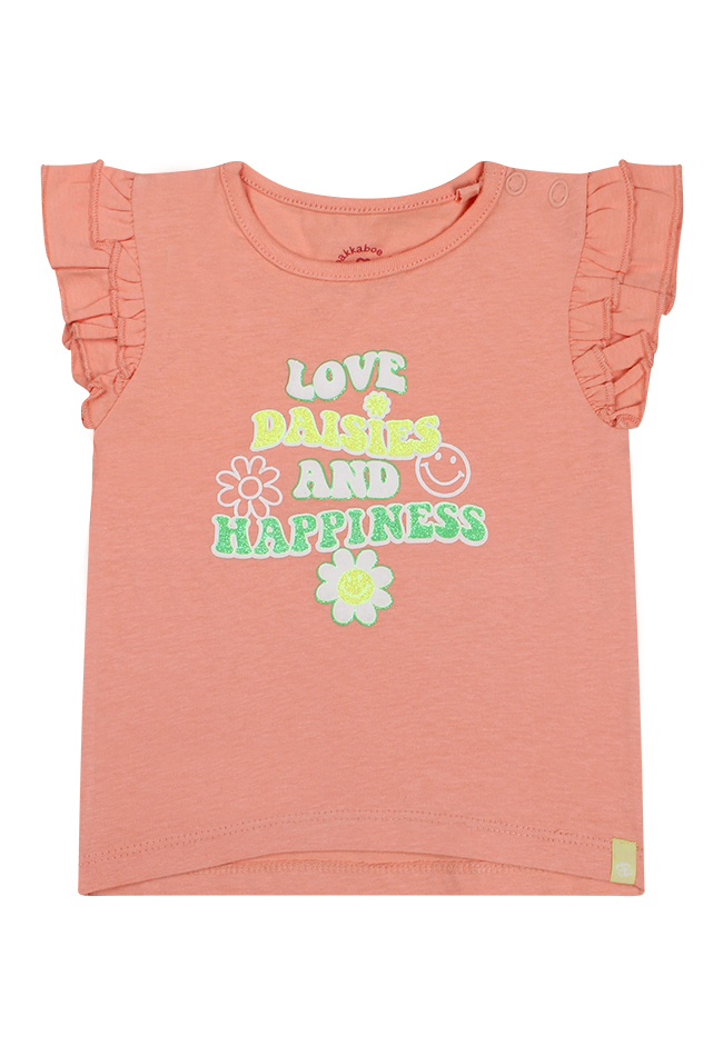 Dit shirtje heeft een korte ruche op de schouders en een ronde hals. Op de voorkant van het t-shirt zit een puff/glitter print. Bij de kleinste maten zitten op de schouder twee drukknoopjes zodat het aan/-uittrekken gemakkelijker gaat. Dit t-shirt is verkrijgbaar in drie zomerse kleuren.