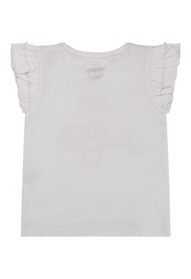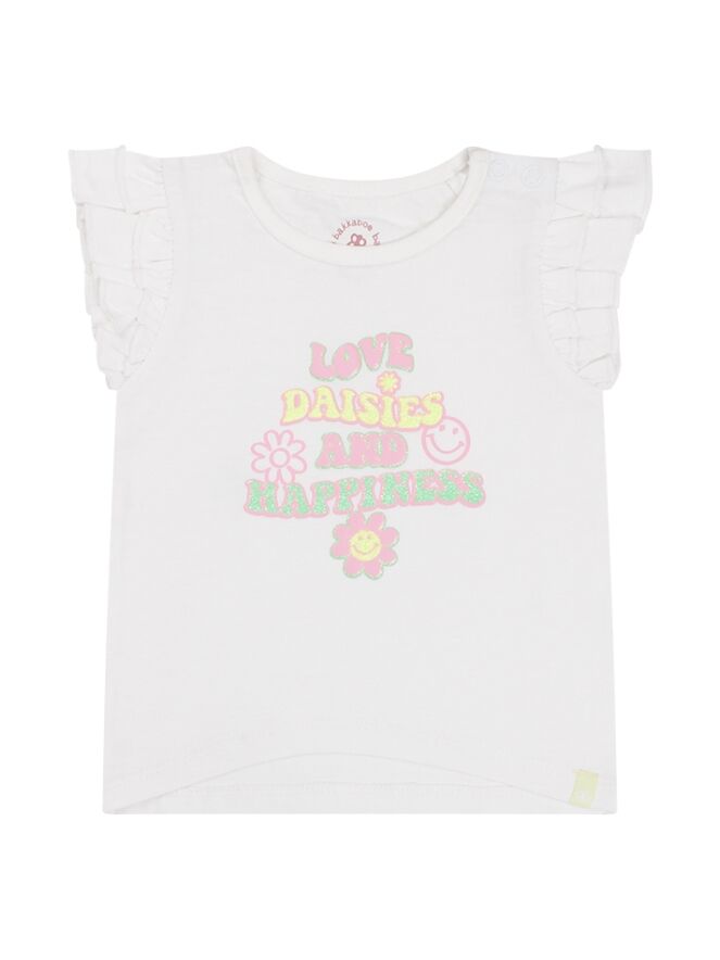 Dit shirtje heeft een korte ruche op de schouders en een ronde hals. Op de voorkant van het t-shirt zit een puff/glitter print. Bij de kleinste maten zitten op de schouder twee drukknoopjes zodat het aan/-uittrekken gemakkelijker gaat. Dit t-shirt is verkrijgbaar in drie zomerse kleuren.