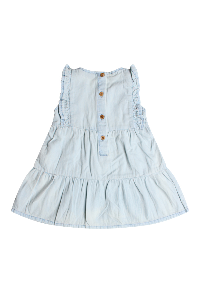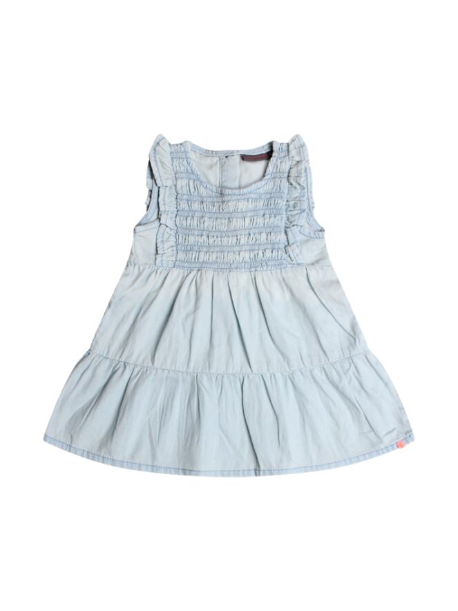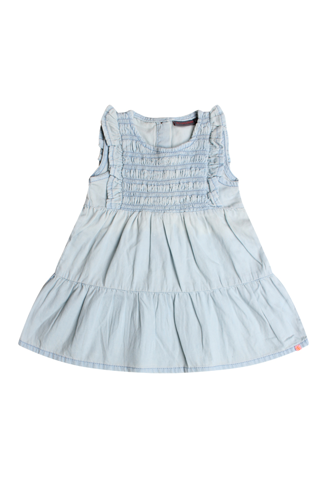 Dit chambrey jurkje heeft een korte ruche op de schouders. Op de achterkant van de jurk zitten vier knoopjes en de voorkant is gesmokt. De jurk is een a-lijn model en het rokdeel bestaat uit twee gerimpelde stroken. De jurk is verkrijgbaar in twee verschillende wassingen.