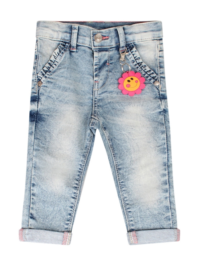 Deze roze spijkerbroek voor meisjes heeft een omslag en heeft een verstelbare tailleband. Dit broekje heeft subtiele roze details en is lekker stretchy. Er zit een bloem smiley sleutelhanger bij de broek.