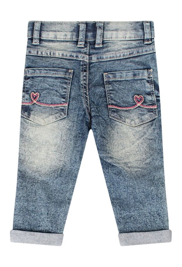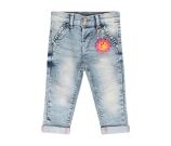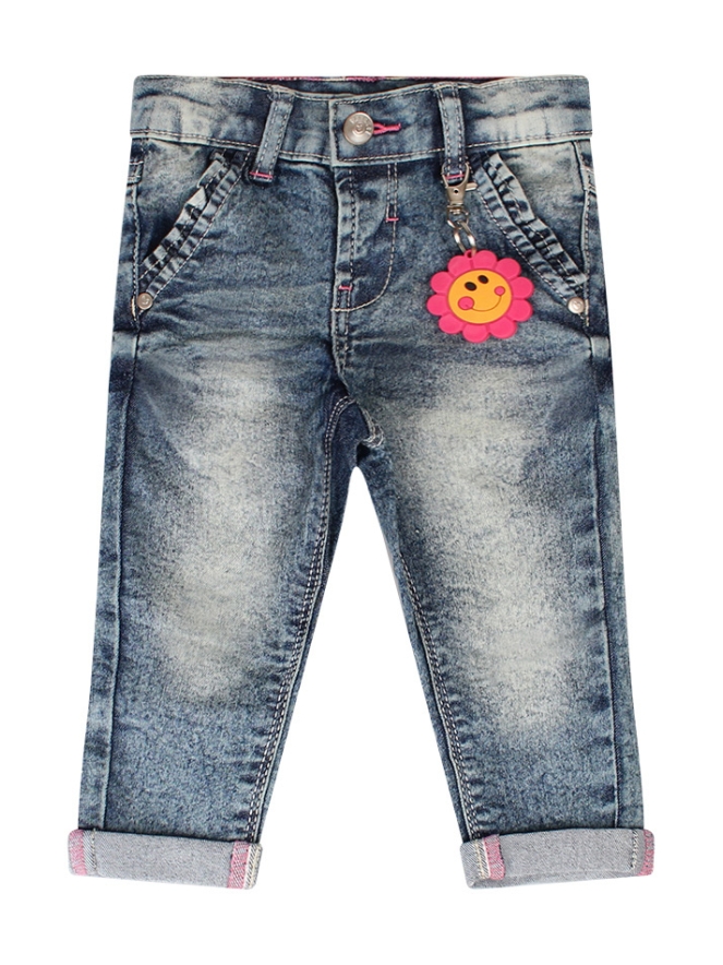 Deze roze spijkerbroek voor meisjes heeft een omslag en heeft een verstelbare tailleband. Dit broekje heeft subtiele roze details en is lekker stretchy. Er zit een bloem smiley sleutelhanger bij de broek.