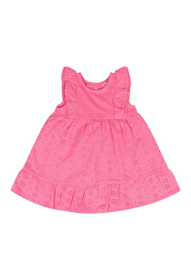 Dit jurkje is een uitlopend modelletje en heeft een broderie rokdeel. Over de schouders lopen ruches ook van broderie. Achter op de rug ter hoogte van de hals wordt het jurkje geslopen met een haakje want daar zit een druppel uitsparing.