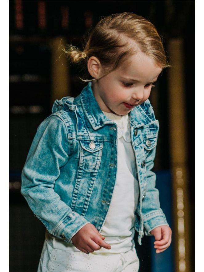 Dit leuke spijkerjasje voor baby meisjes heeft leuke details zoals ruches over de schouders, elastiek in de taille en een bleached look. De maatserie loopt door in artikelnummer Z80026 van Persival.
