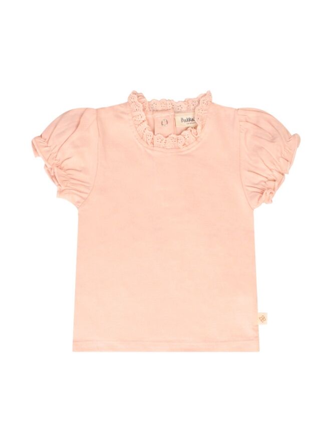 Dit shirtje heeft ruche op de schouder en een broderie randje rond de hals.