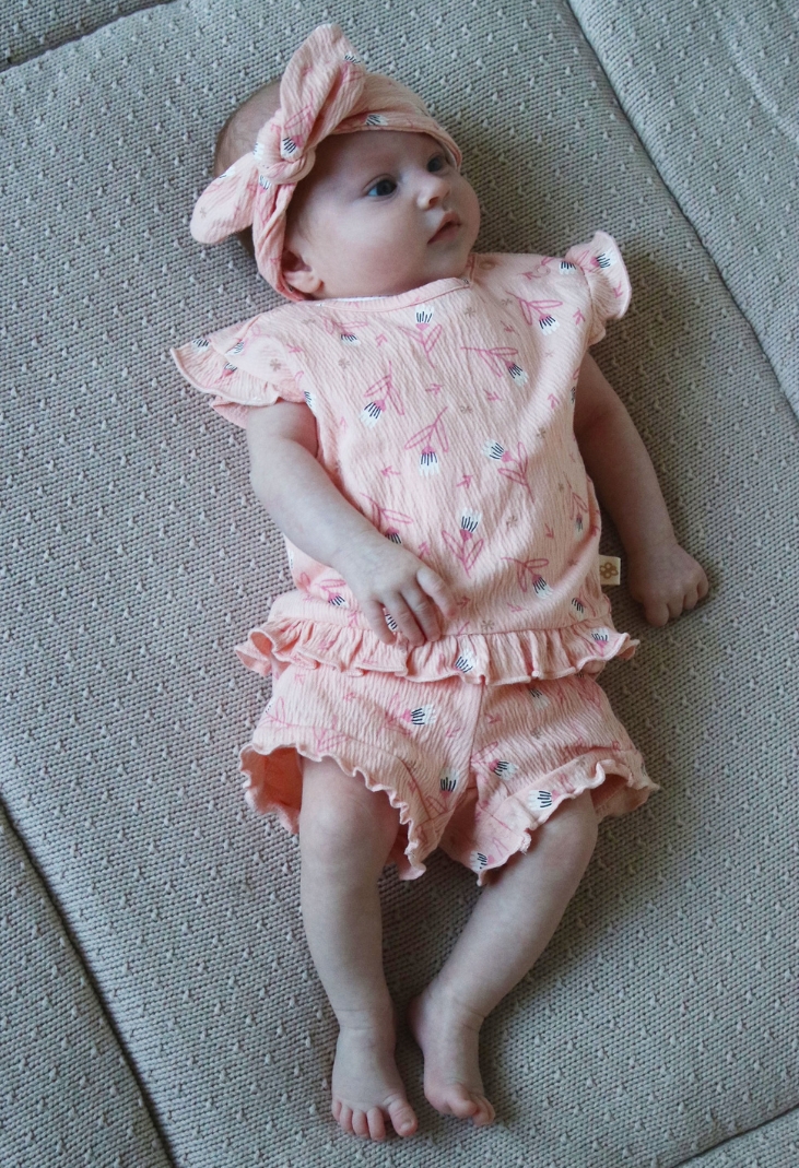 Deze haarband heeft een bloemetjes print. De stof heeft een kreuk effect. In dezelfde stof en print is er ook een shirt en short verkrijgbaar. Art.nr Shirt Z80302 Short Z80301