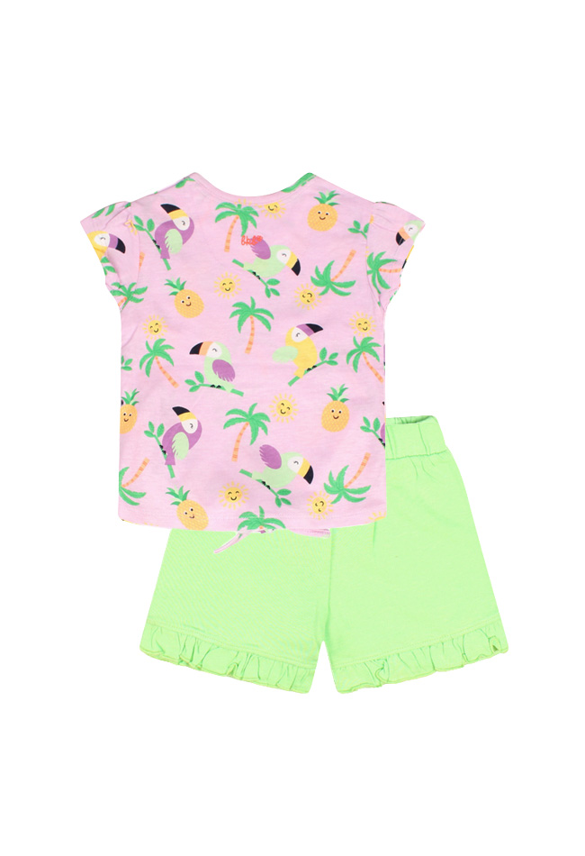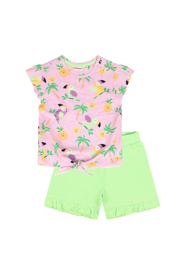 Dit setje bestaat uit een T-shirtje met vrolijke print en een effen gekleurd broekje. Het broekje heeft een strikje en ruches rond de pijpen.
