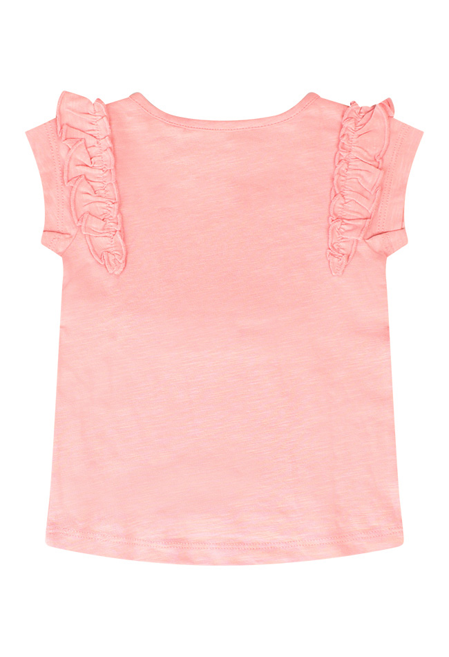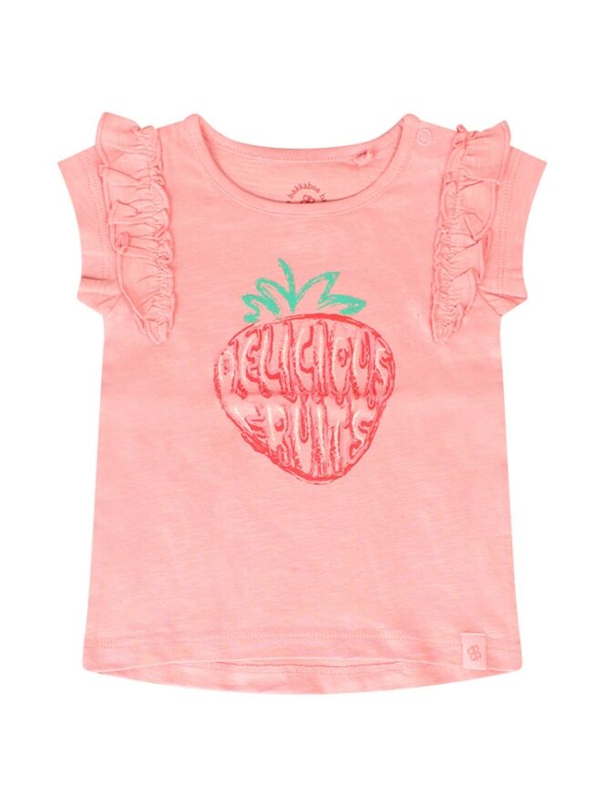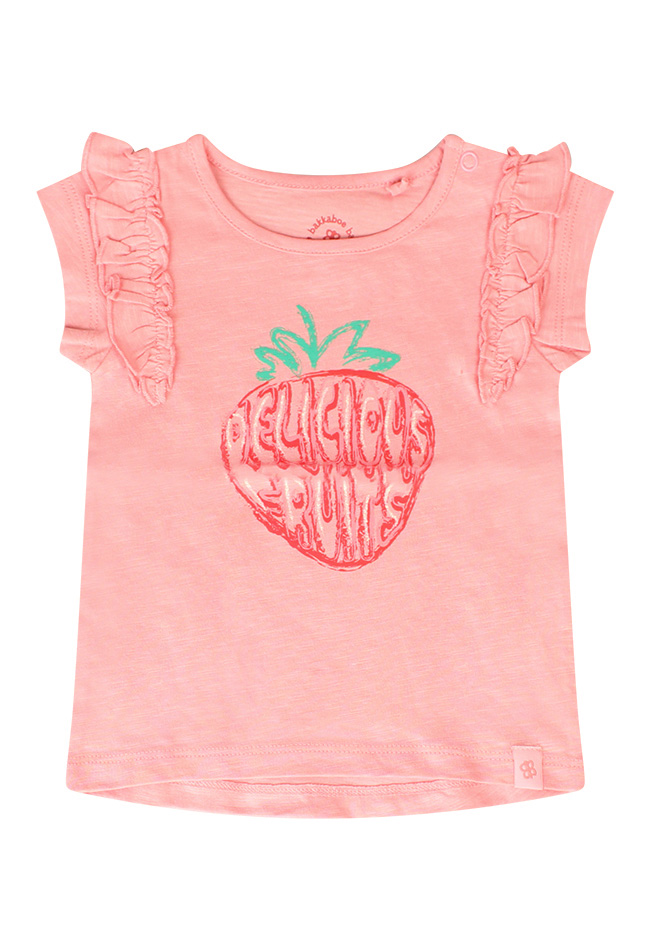 Dit T-shirt een ruche over de schouder en een aardbeien print.