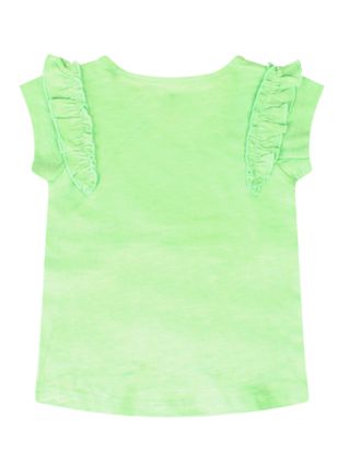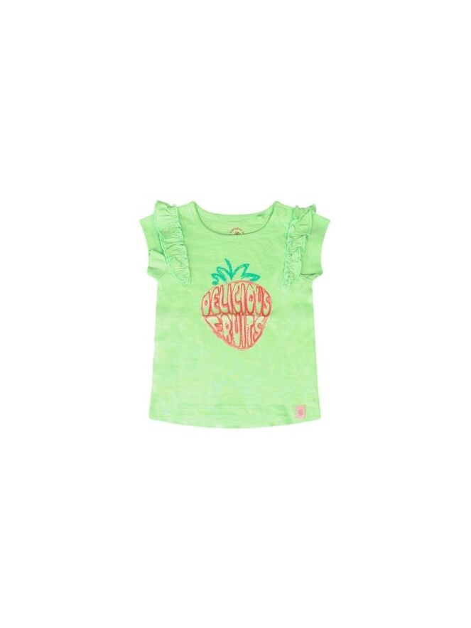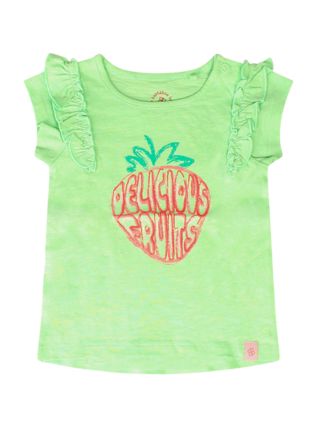 Dit T-shirt een ruche over de schouder en een aardbeien print.