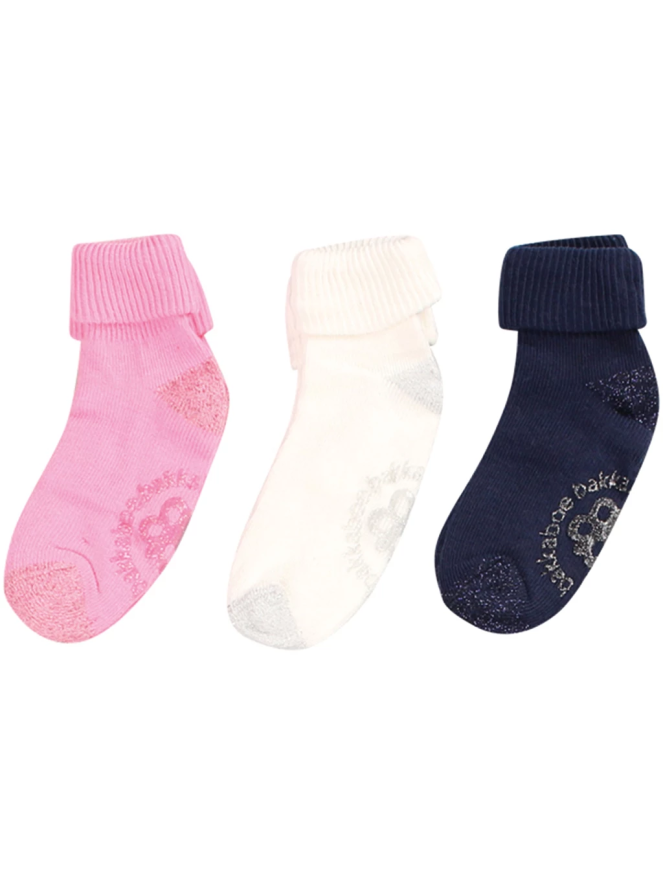 Deze sokken zitten per 3 verpakt, hebben anti slip onder de voet en een omslagje.
