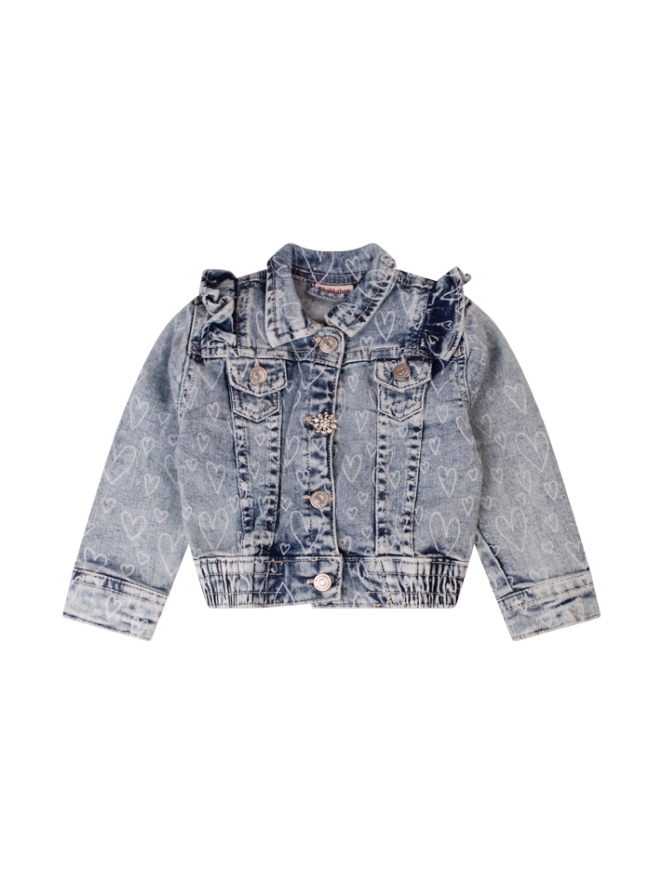 Dit stoere spijkerjasje voor babymeisjes heeft een schattige all-over hartjesprint en sierlijke ruches op de schouder. Het jasje is afgewerkt met een prachtig detailknoopje, wat het een extra lief en uniek item maakt om elke outfit compleet te maken.
