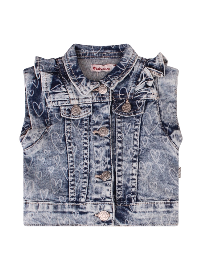 Dit stoere denim gilet voor babymeisjes heeft een schattige all-over hartjesprint en mooie ruches op de schouder. Het perfecte item om elke outfit af te maken.