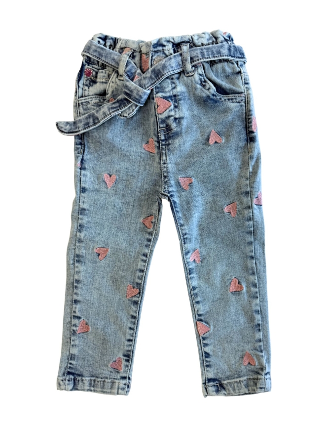 Leuker worden ze niet! Deze spijkerbroek vol met roze geborduurde hartjes is een 5 pocket model met elastische tailleband en bijpassende spijker strikceintuur. Rechte broekspijp en hoog in de taille.