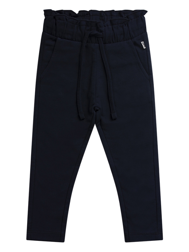 Heel vlot hip trendy jogging sweat broekje voor baby meisjes met een vrolijke tailleband met ruche. Dit broekje is een paperbag model met steekzakken en achterop twee sier paspelzakjes.