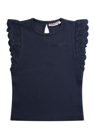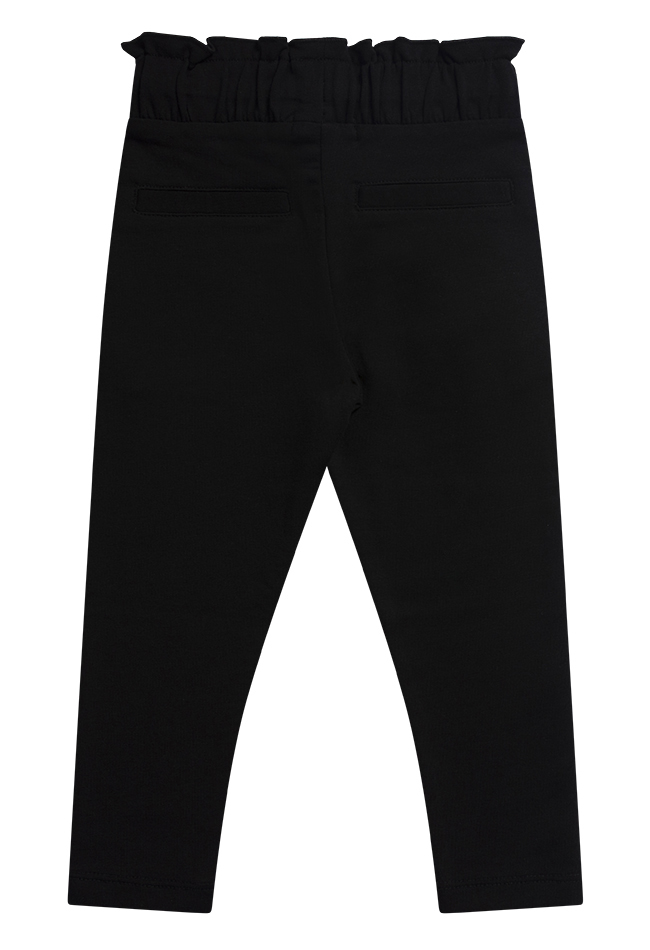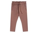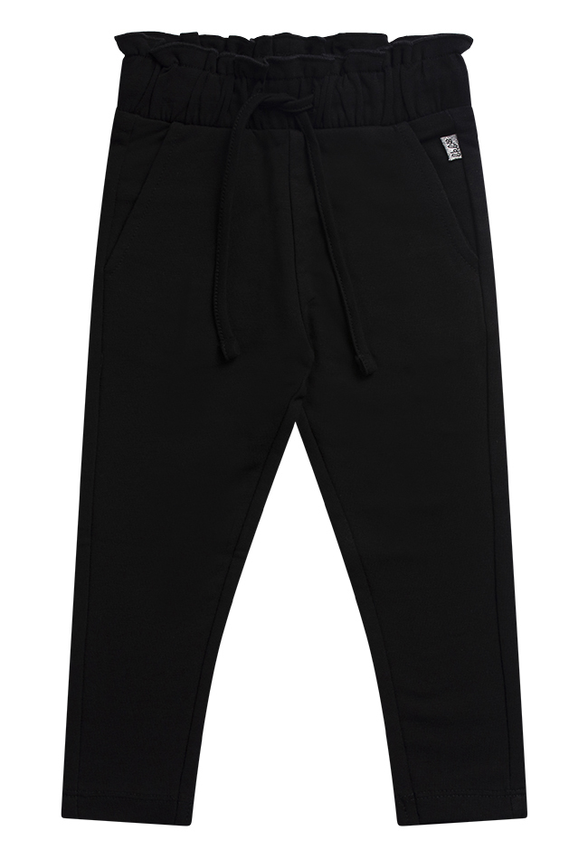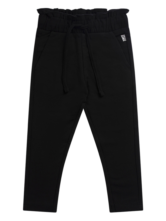Heel vlot hip trendy jogging sweat broekje voor baby meisjes met een vrolijke tailleband met ruche. Dit broekje is een paperbag model met steekzakken en achterop twee sier paspelzakjes.