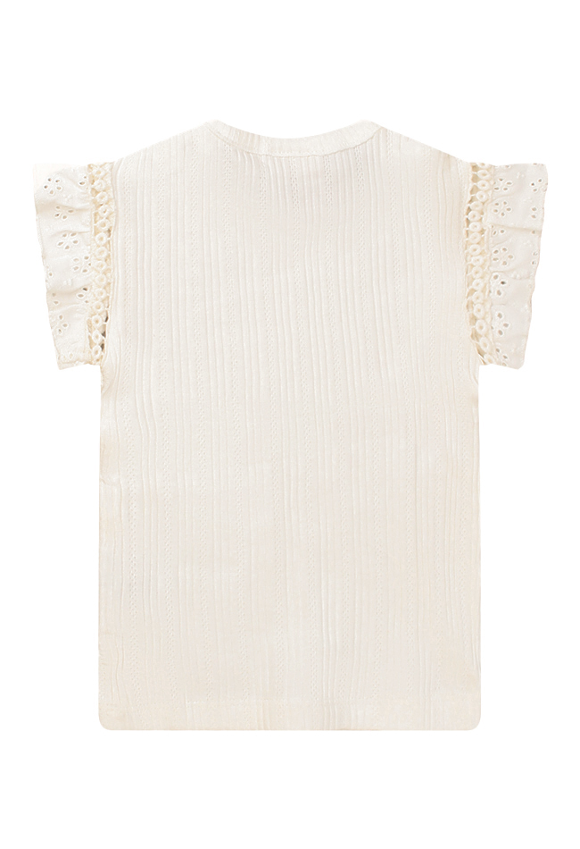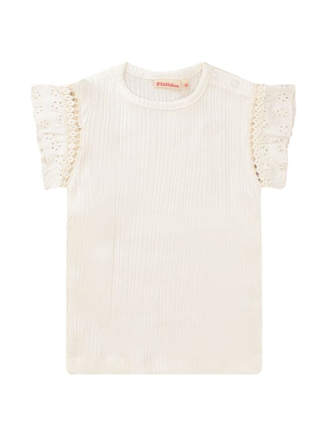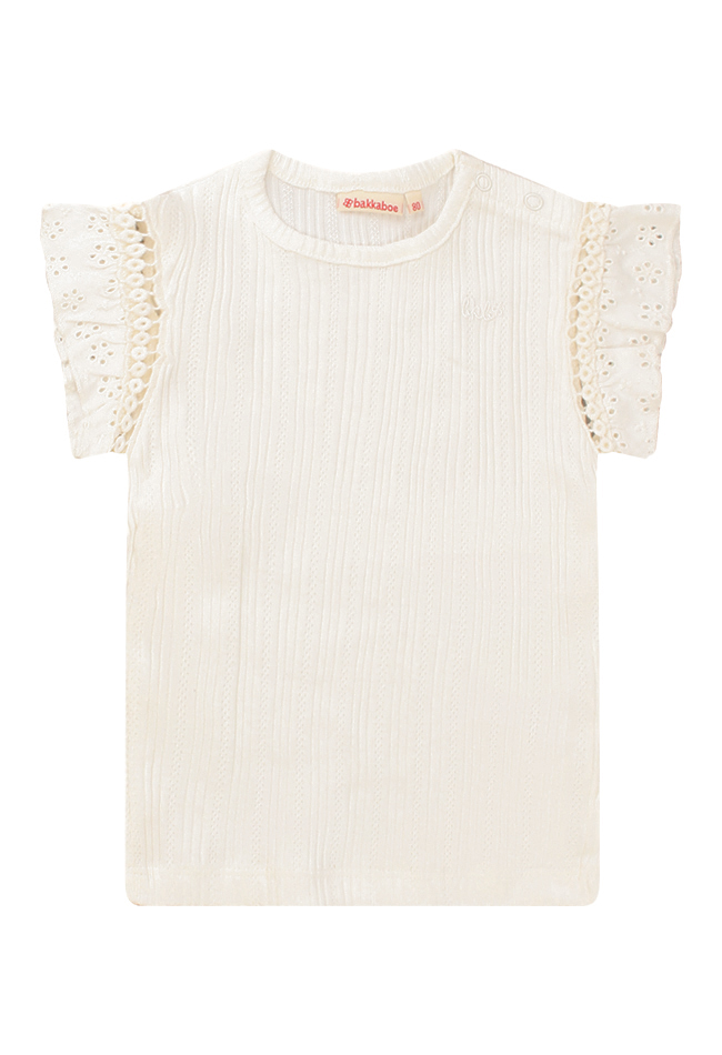 Dit schattige babyshirt van Bakkaboe is een perfecte basic met een luxe touch! Gemaakt van zachte ribstof met broderie mouwtjes voor een elegante uitstraling. Let op: de zalmkleurige top is lichter en heeft een oudroze/mauve tint.