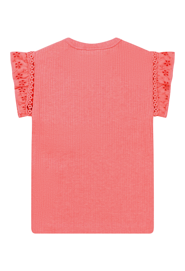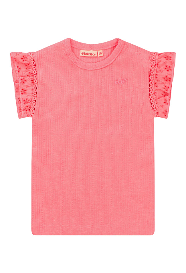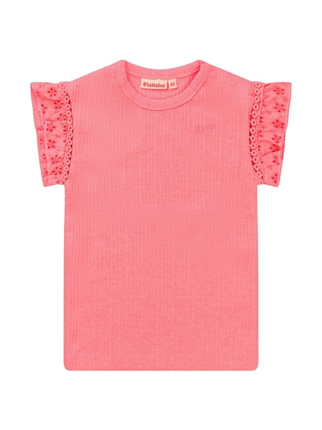 Dit schattige babyshirt van Bakkaboe is een perfecte basic met een luxe touch! Gemaakt van zachte ribstof met broderie mouwtjes voor een elegante uitstraling. Let op: de zalmkleurige top is lichter en heeft een oudroze/mauve tint.