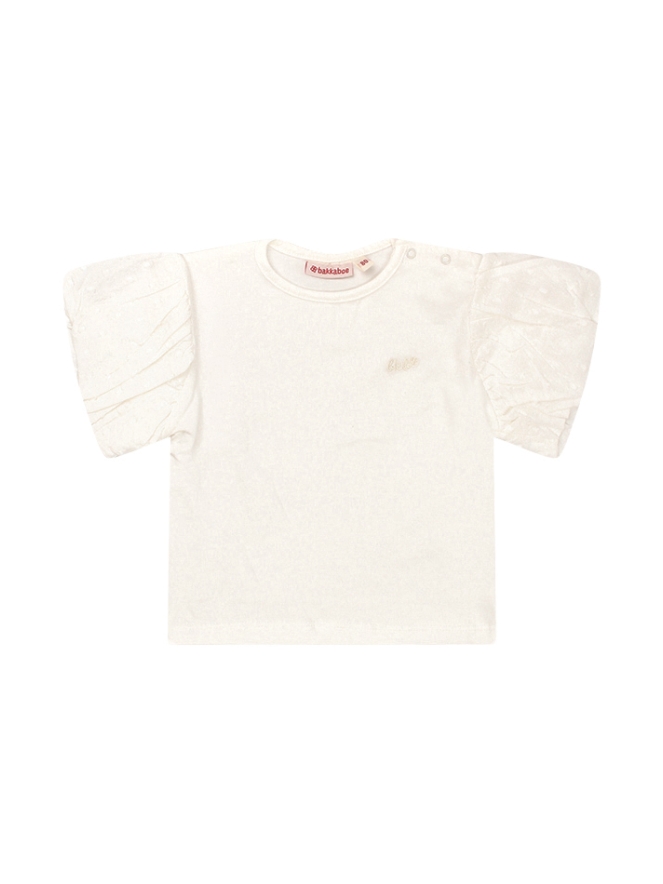 Dit T-shirtje is een speciale! Speciaal door zijn korte ballonmouw van een mooie stof met een relief er in. Je combineert het makkelijk met korte of lange broeken, leuke flairs of wellicht een stoere skort!