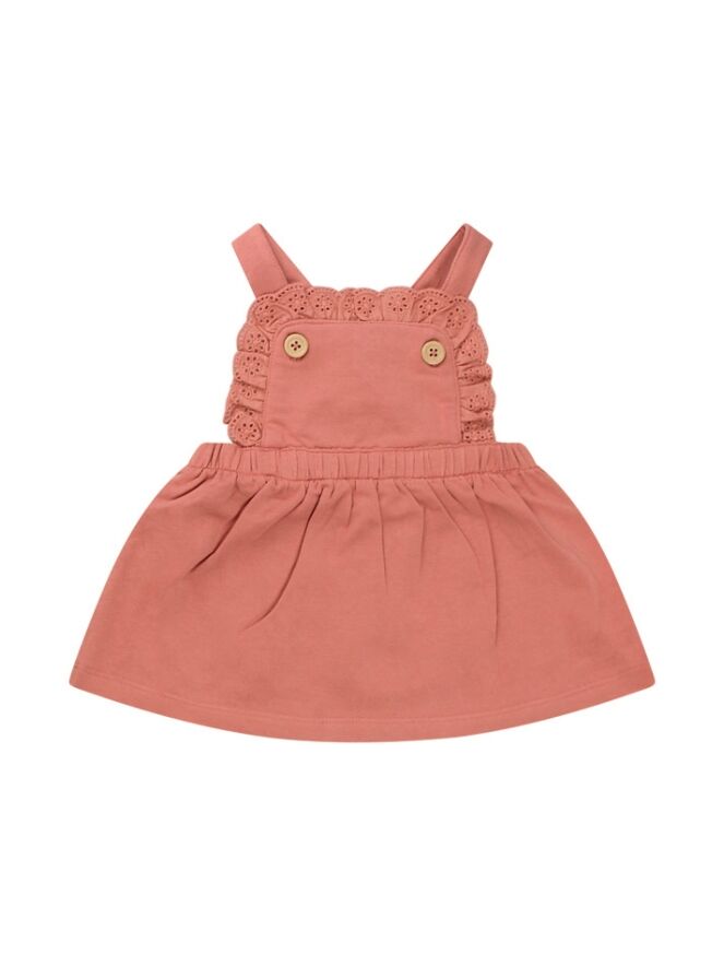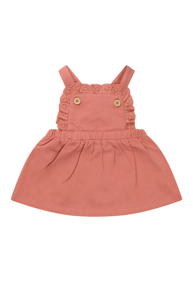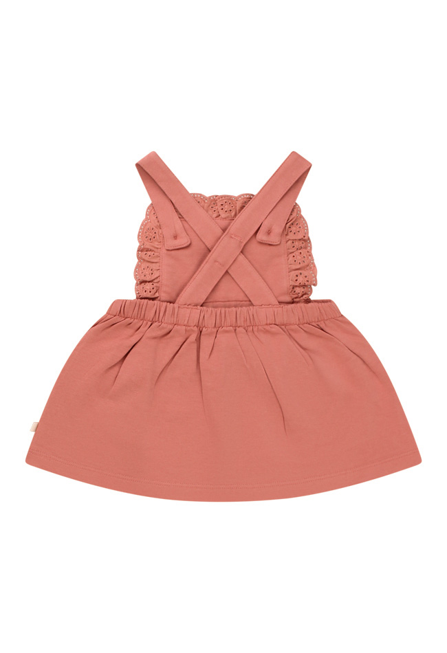 Dit jurkje voor newborn meisjes heeft een broderie afwerking en kruisbandjes over de rug. De bandjes worden voor vastgezet met een knoop. Lekker makkelijk om te wisselen!