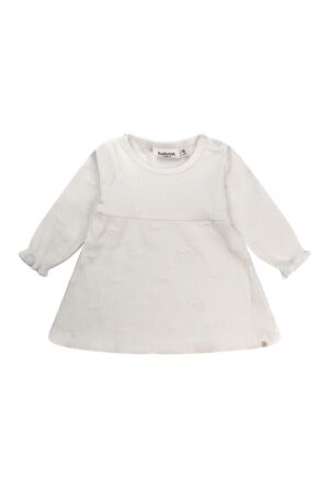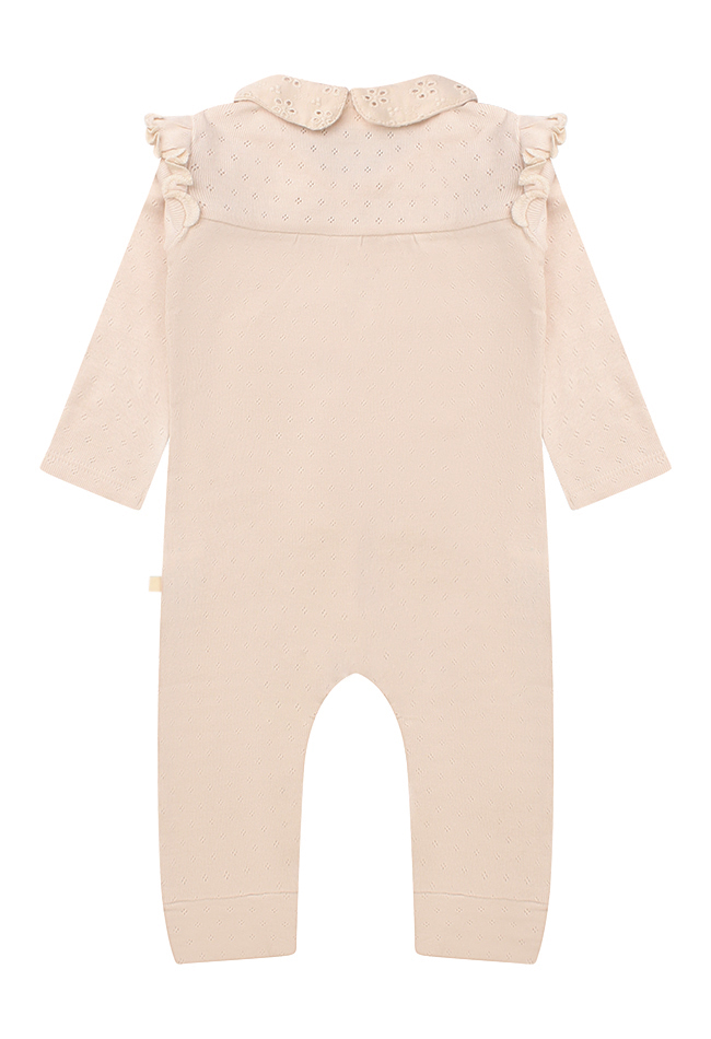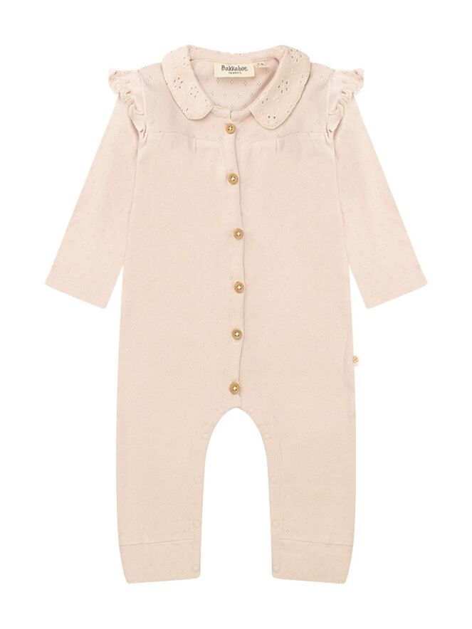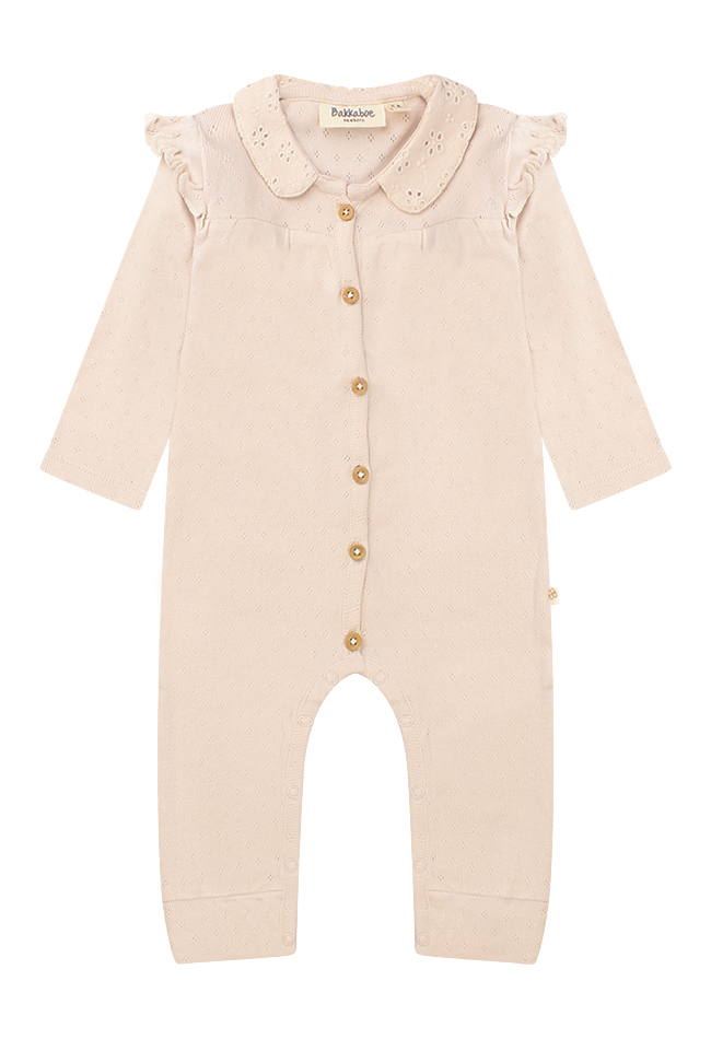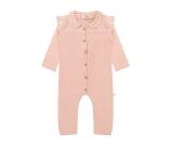 Mini jumpsuit voor mini mensjes. Dit pakje met houtlook knoopjes en drukknoopjes langs de benen en het kruis is makkelijk aan en uit te krijgen. Met mooie broderie kraag en ruches op de schouder heb je gelijk een kleine fashionista in de dop!