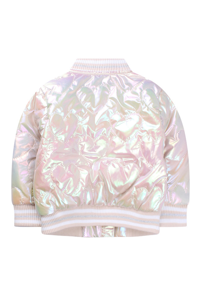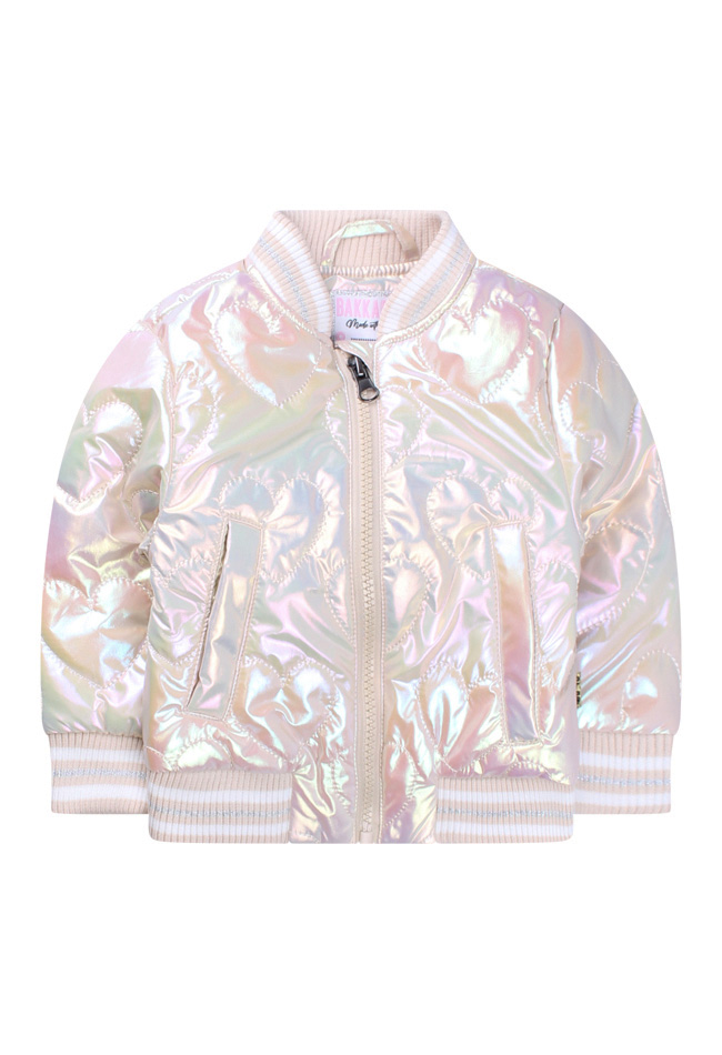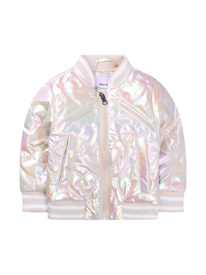 Metallic it is! Dit leuke bomberjackje heeft hartjes gestikt in de metalic stof. 2 Steekzakken en een rits. Is de grootste maat net te klein voor jouw meisje? Dezelfde jas is er ook van Perzival!