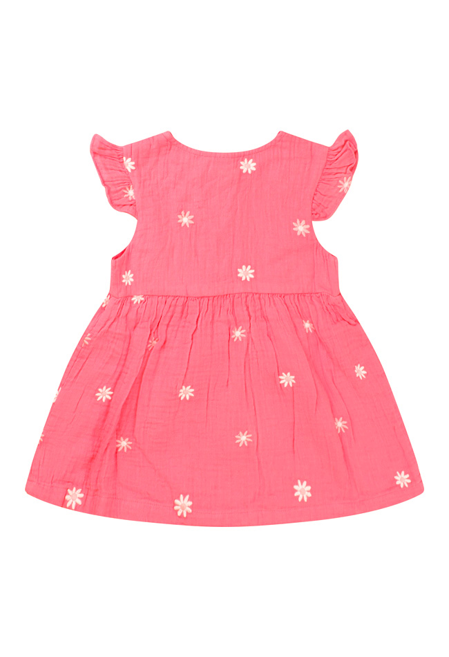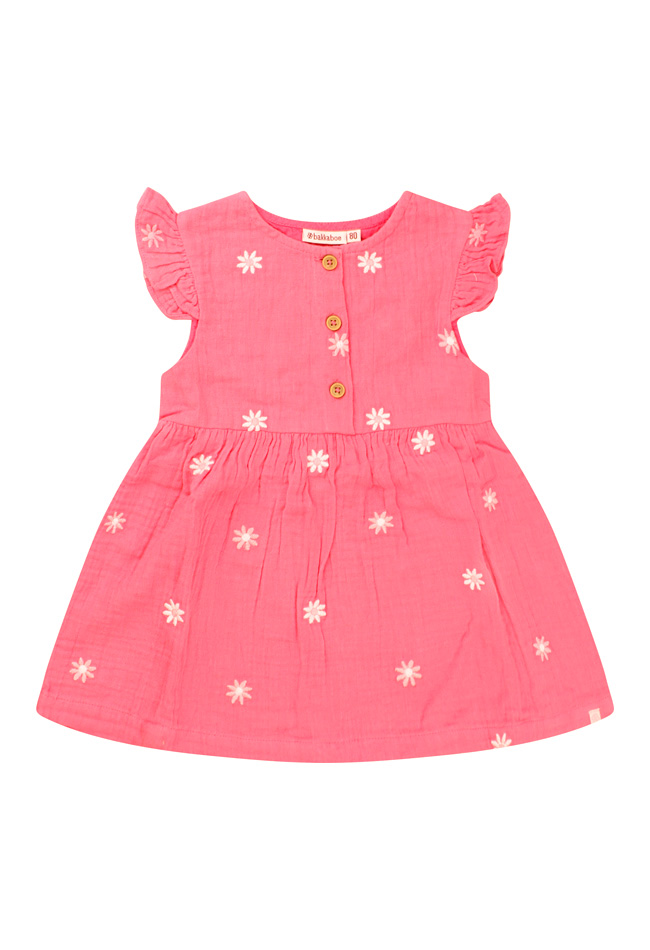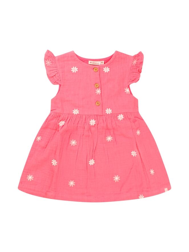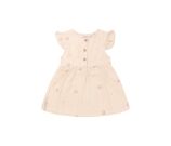 Zoet zoeter deze is mega zoet! Dit lieve jurkje voor baby meisjes sluit met houtlook knoopjes aan de voorkant en heeft mooie geborduurde bloemen over het gehele jurkje. Is het een warme dag? Trek haar dan deze aan want mousseline katoen draagt als linnen!