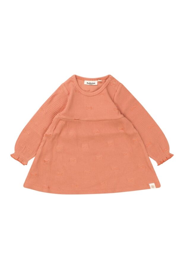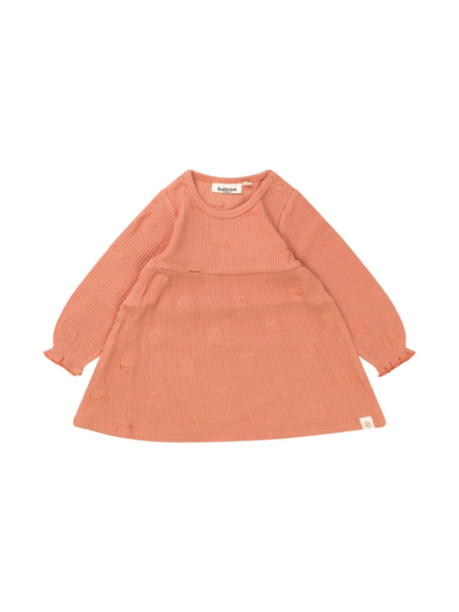Leuk jurkje voor newborn meisjes. Dit jurkje gemaakt van een elastische rib heeft kleine opgeborduurde strikjes. Sweet!
