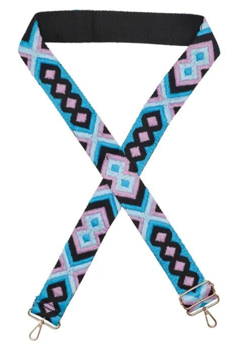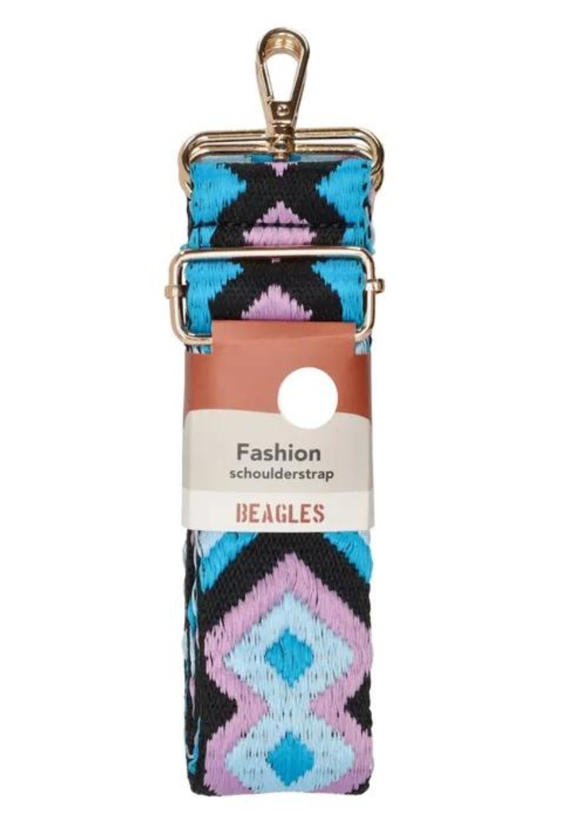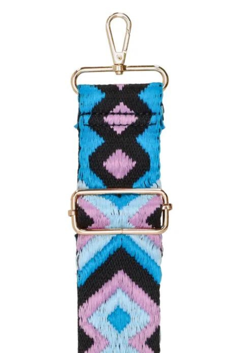 trendy schouderband met retro ikat print in blauw, paars en zwart, afgewerkt met een gouden gesp. Deze veelzijdige shoulder strap kan worden bevestigd aan elke tas, waardoor je jouw favoriete tas een frisse en modieuze uitstraling geeft.