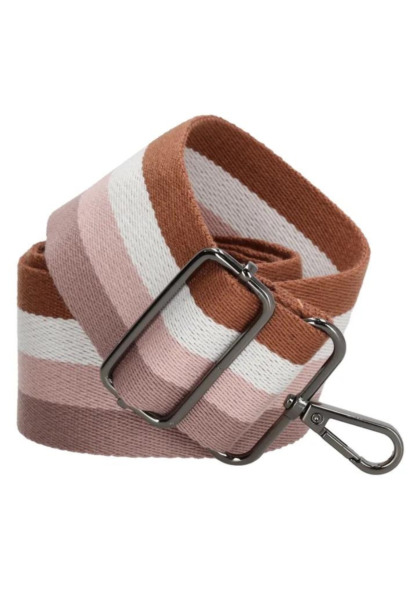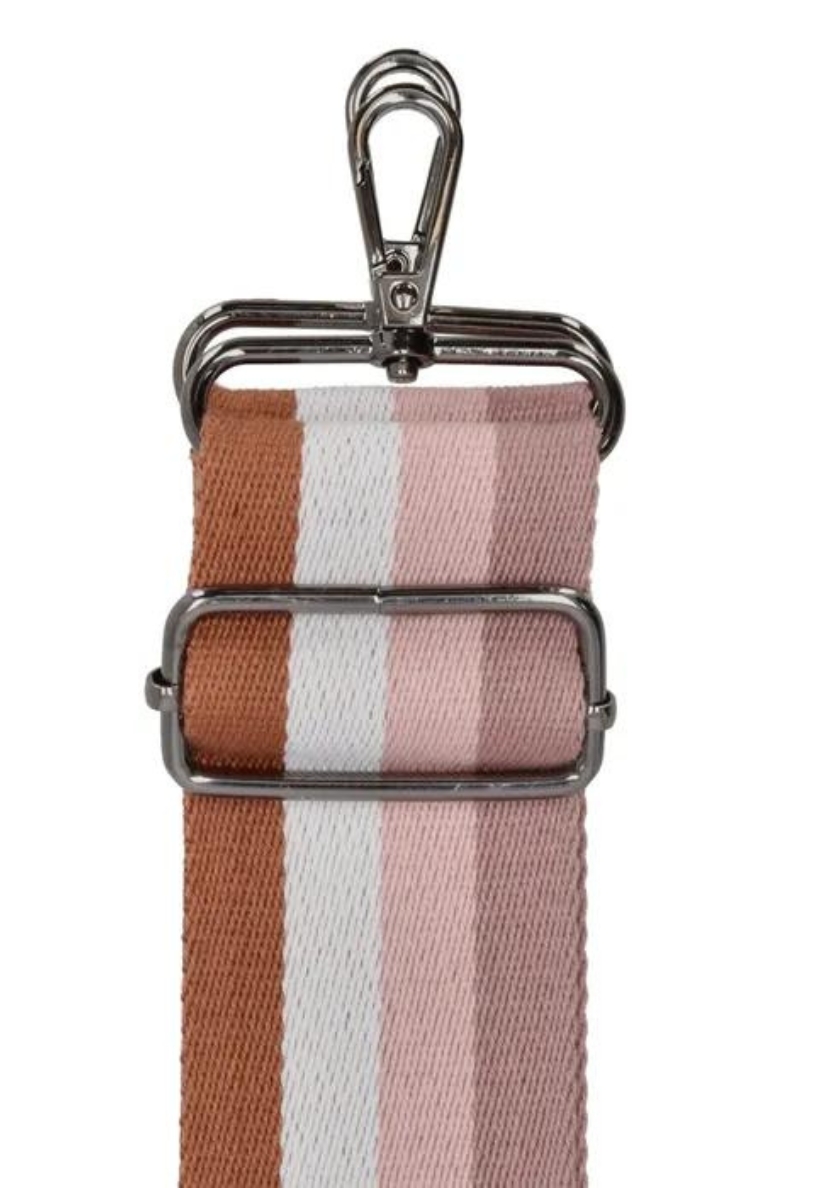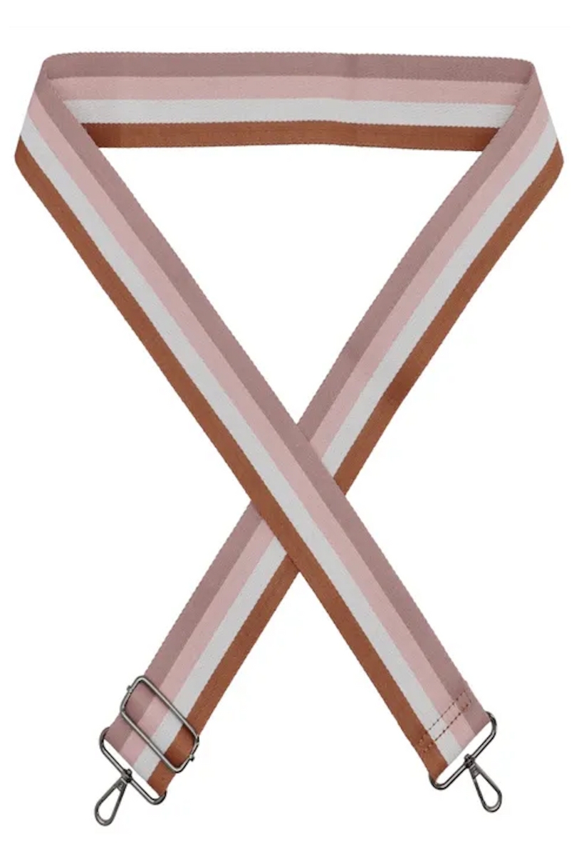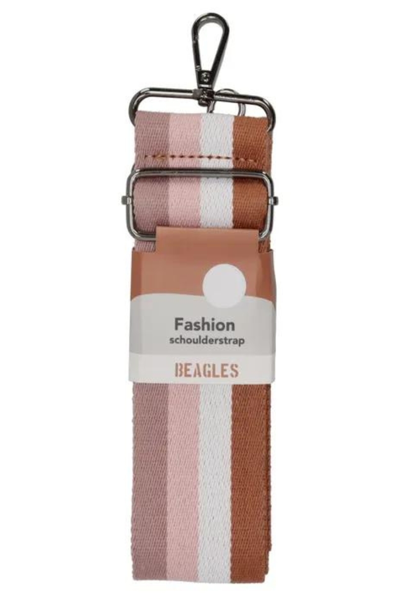 Trendy schouderband met streep motief in bruine en roze kleuren, afgewerkt met een gun metaal kleur gesp. Deze veelzijdige shoulder strap kan worden bevestigd aan elke tas, waardoor je jouw favoriete tas een frisse en modieuze uitstraling geeft.