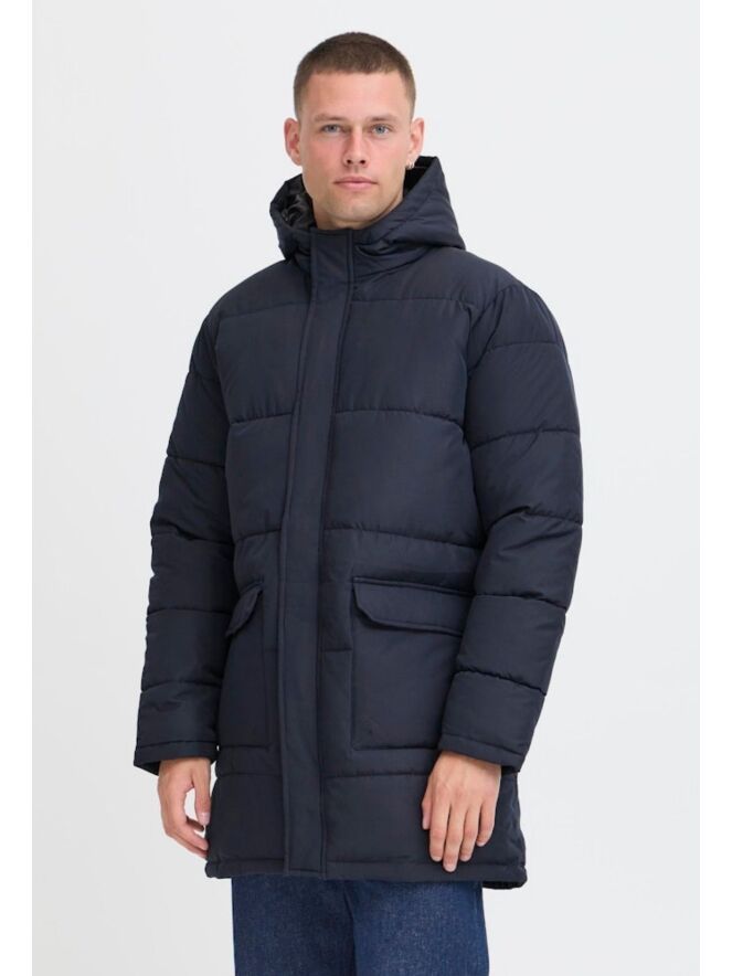 Diep donkerblauwe parka van Blend met vaste capuchon, grote klepzakken en steekzakken voorop. Tijdloos, warm en casual!