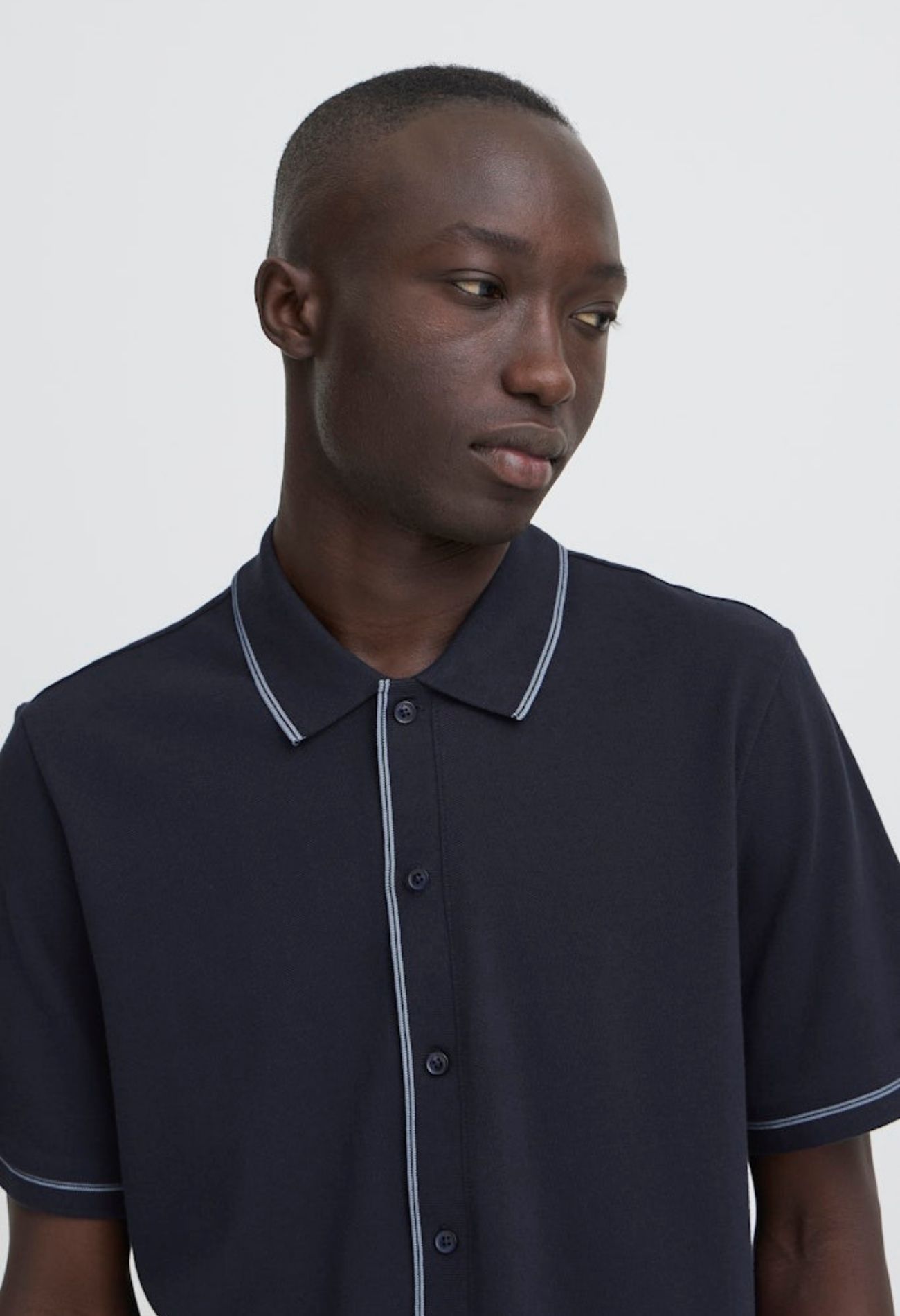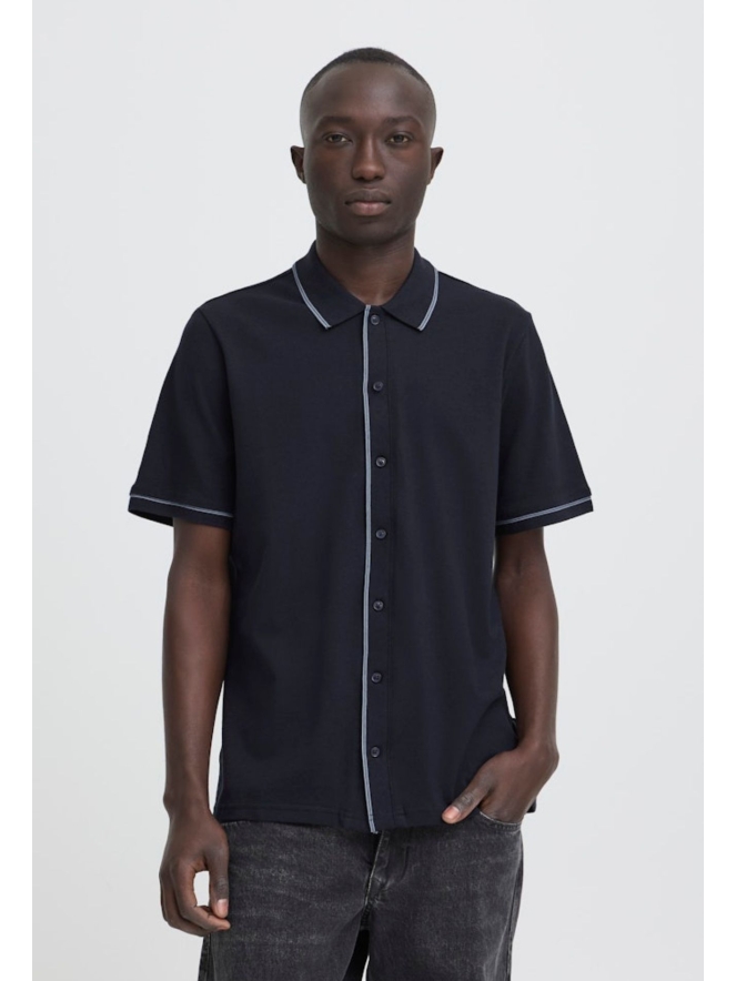 Deze stijlvolle donkerblauwe polo voor heren combineert het nette van een blouse met het comfort van een klassieke polo. Het doorknoopmodel geeft een verfijnde uitstraling en maakt de polo veelzijdig: draag hem casual open op een jeans of volledig dichtgeknoopt voor een meer geklede look.