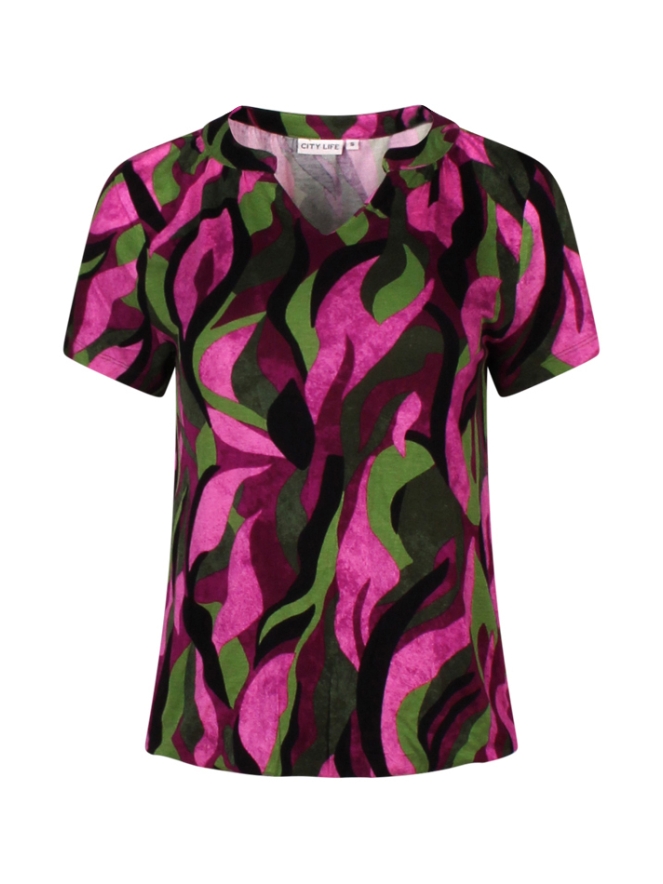 Kleurrijk T-shirtje van jerseykatoen. Rekt lekker mee en heeft een elastiek onder in de taille. Dit shirtje heeft een kleine V hals en leent zich uitstekend voor uitstapjes, blokjes om op de fiets, boodschappen, feestjes, werk of gewoon lekker thuis in de tuin of op de bank.