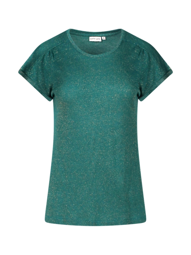Bling bling! Dit T-shirtje heeft een flinke hoeveelheid glitterdraad door de stof waardoor je er niet onderuit komt om te shinen! Rekbare soepele stof met een omslagje in de mouw.