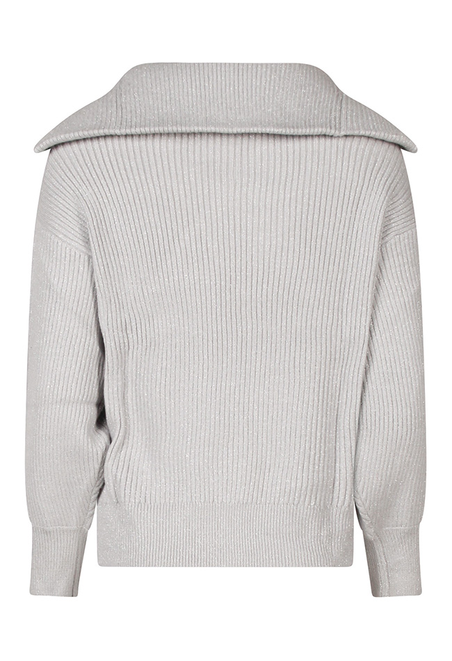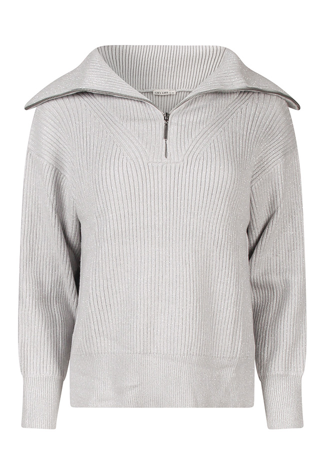 Deze rib gebreide trui heeft een echte schipperstrui look. Met heerlijke warme dicht te ritsen kol. In het garen zit een lurex glitterdraad verweven wat deze trui echt anders maakt.