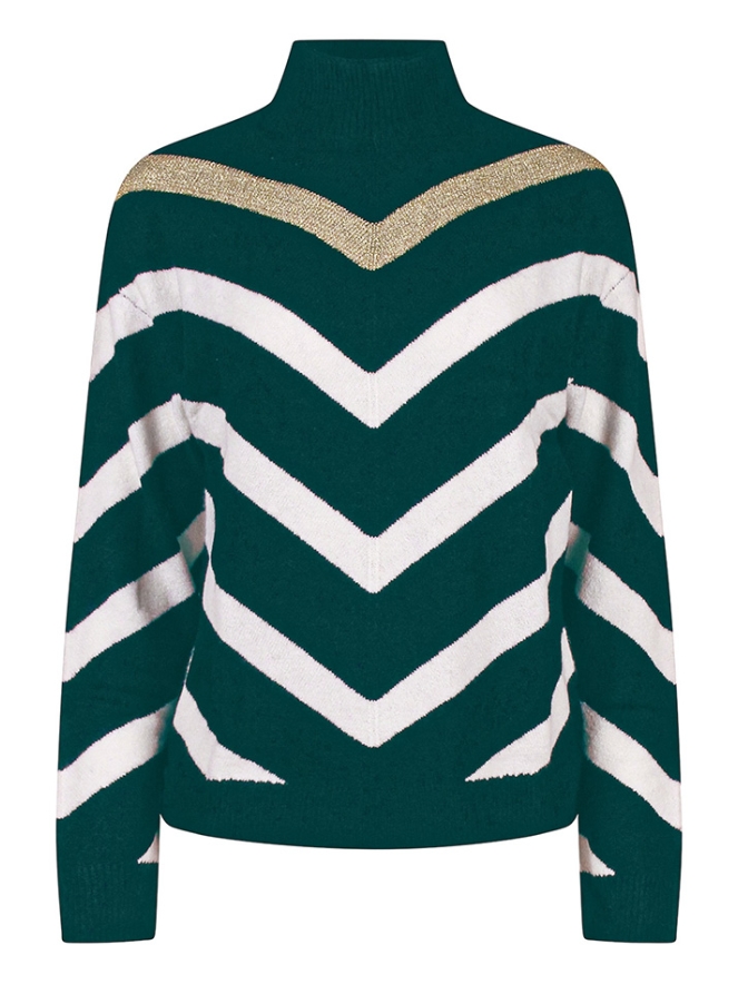 Dunne gebreide trui met groot V - patroon. Met een baan met glitter lurex.
